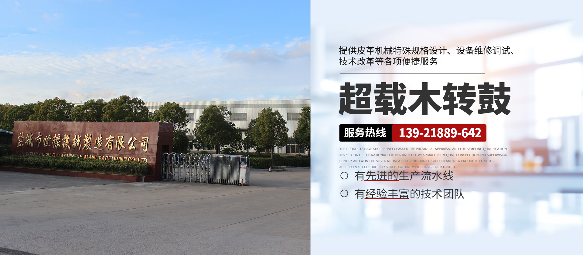 本公司常年提供超載木制轉(zhuǎn)鼓( 意大利/西班牙版本)、GJOB1-2型懸掛式木制轉(zhuǎn)鼓、鐵制轉(zhuǎn)鼓、Y型不銹鋼全自動分格鼓、全自動不銹鋼圓形、八角形摔軟轉(zhuǎn)鼓、PP染色等多功能轉(zhuǎn)鼓、HC系列劃槽、不銹鋼試驗(yàn)轉(zhuǎn)鼓等皮革機(jī)械產(chǎn)品,產(chǎn)品暢銷浙江、山東、廣東、福建、河南、河北、四川、新疆、遼寧等地,且遠(yuǎn)銷非洲、東南亞、南美洲、中美洲等多國,深受各大制革廠家的青睞。產(chǎn)品相繼通過省級鑒定和全國皮革、制鞋機(jī)械質(zhì)量檢測監(jiān)督中心的抽樣合格檢驗(yàn),在2010中國高新技術(shù)、新產(chǎn)品博覽會上一舉榮登銀獎寶座,其配件鋼芯泥塑鼓樁獲 專利權(quán)。本公司并向客戶提供皮革機(jī)械特殊規(guī)格設(shè)計(jì)、設(shè)備維修調(diào)試、技術(shù)改革等各項(xiàng)便捷服務(wù),具有健全的檢測體系和可靠的售后服務(wù)。